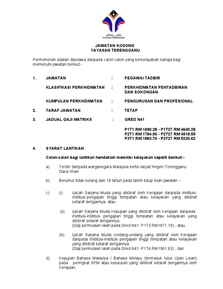 Related : Jawatan Kosong Yayasan Terengganu : Permohonan adalah dipelawa daripada warganegara malaysia yang berkelayakan untuk mengisi kekosongan jawatan kosong terkini di yayasan pembangunan keluarga terengganu (ypkt) sebagai.