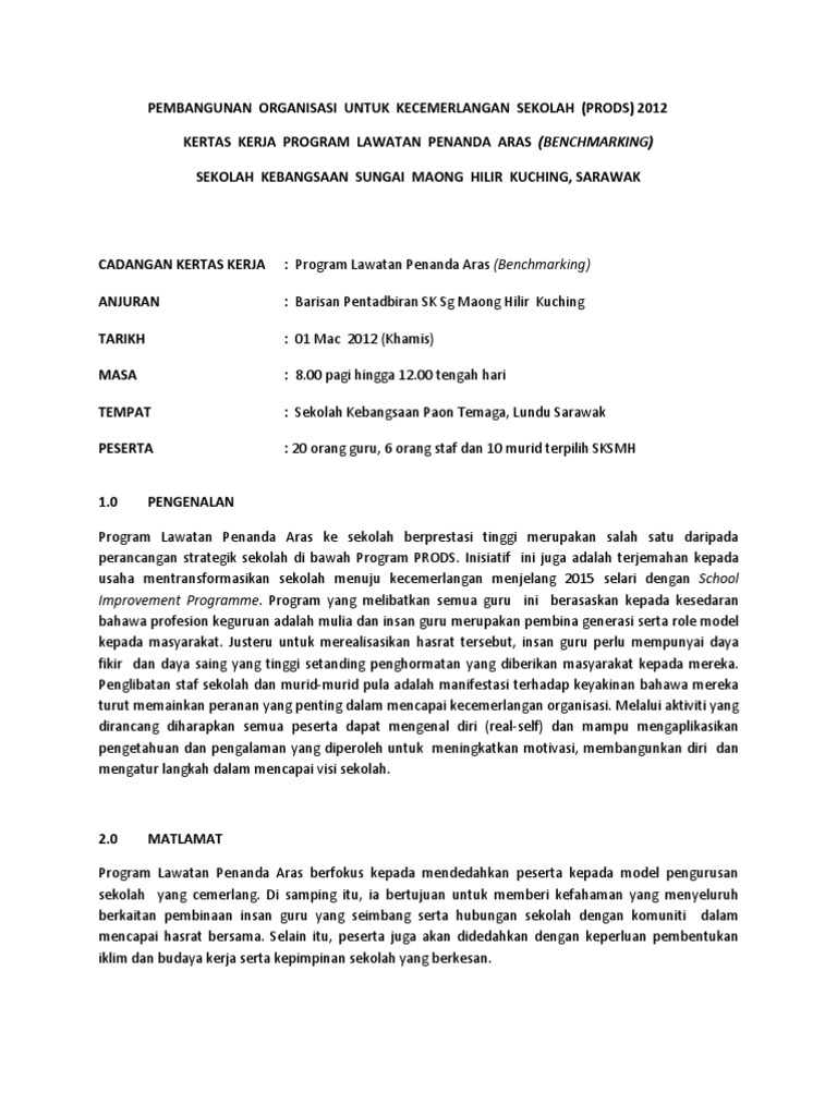 Kertas Kerja Lawatan Penanda Aras from imgv2-1-f.scribdassets.com Lawatan ini bertujuan untuk berkongsi maklumat terkini mengenai program pendidikan pencegahan dadah serta percambahan idea… pada 12 mac 2014, sekolah kebangsaan kota masai telah menerima lawatan daripada tuan haji moh noh bin morli, ketua unit ppda jabatan pendidikan. Lawatan penanda aras kali pertama pada tahun 2012 ini menghala ke sekolah s tengku !ariam, atu #ahat. Lawatan ini telah mendapat kerjasama yang baik daripada #ersatuan $bu apa dan %uru s ing. Sekolah ini dipilih kerana kecemerlangan sekolah tersebut dalam pencapaian kurikulum. Ajk (rosiah binti senu) (riwan bin ali) setiausaha pengerusi lawatan penanda aras lawatan penanda aras sekolah kluster. Peserta lawatan penanda aras program 5s. Aplikasi download karnival stem peringkat sekolah kebenaran. Surat lawatan penanda aras via www.scribd.com.